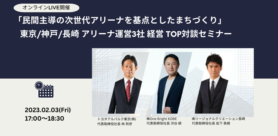 神戸アリーナプロジェクトを推進する株式会社One Bright KOBE(住所:兵庫県神戸市、代表取締役社長 渋谷 順)は、TOKYO A-ARENA PROJECT(東京・お台場/青海)運営会社:トヨタアルバルク東京株式会社(住所:東京都文京区、代表取締役社長 林 邦彦)と長崎スタジアムシティプロジェクトの運営会社:株式会社リージョナルクリエーション長崎(住所:長崎県長崎市、代表取締役社長 岩下 英樹)の3社にて、「民間主導の次世代アリーナを基点としたまちづくり」をテーマに、各社の取り組みを紹介するオンラインセミナーを開催いたします。